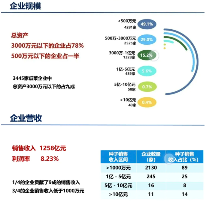 从企业营收看,2023年全国种业企业共实现种子销售收入1258亿元,平均利润率在8.23%;有3/4企业的销售收入低于1000万元;有1/4企业的销售收入超过 1000万元,这1/4企业贡献了全国种业销售收入的9成。