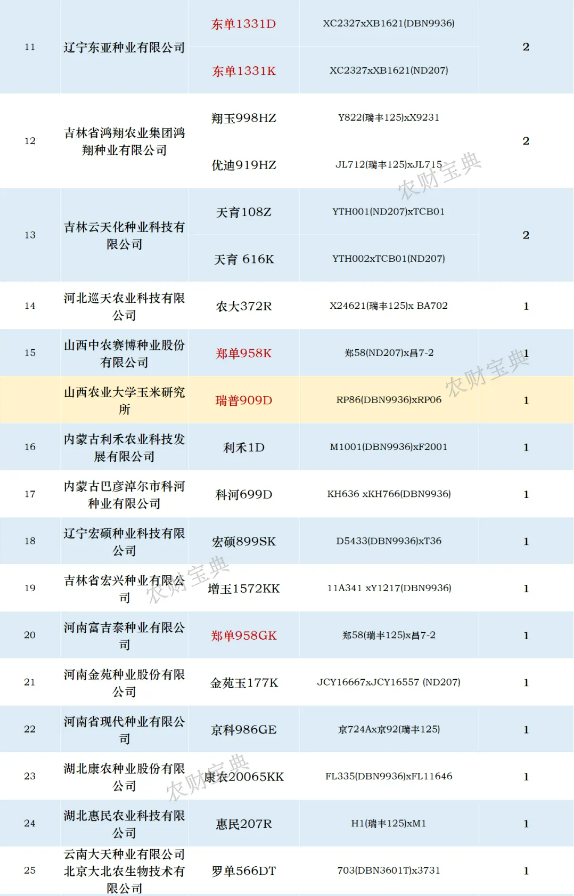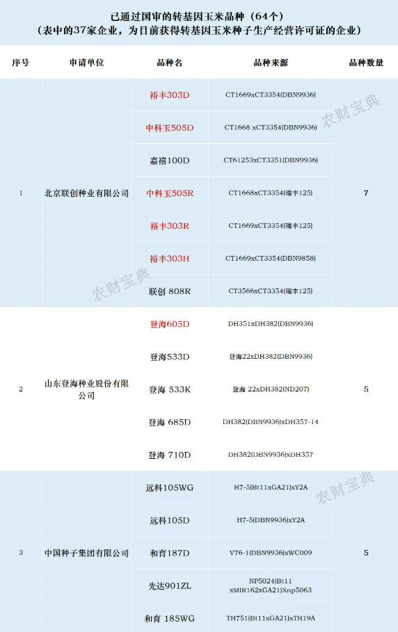 目前我国已有两批次,共计64个转基因玉米、17个转基因大豆通过国家审定。其中拥有转基因玉米品种数量较多的有隆平高科旗下的联创种业,登海种业,先正达旗下的中国种子集团等。北京市农林科学院玉米研究所、山西农业大学玉米研究所、中国农业大学等科研机构有转基因玉米品种通过审定。