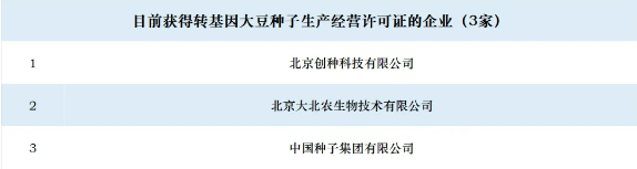 另外,据公开信息可知,目前全国范围内已获得转基因玉米种子生产经营许可证(G证)的共37家,获得转基因大豆种子生产经营许可证(G证)的有3家。中国种子集团、大北农(含旗下子公司)是少数同时拥有转基因玉米、大豆生产经营许可证的的企业。