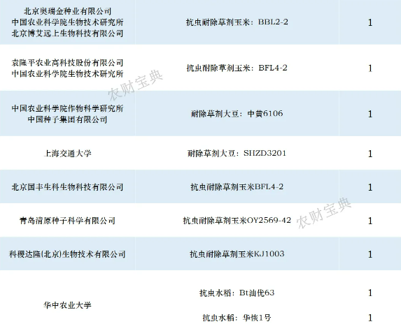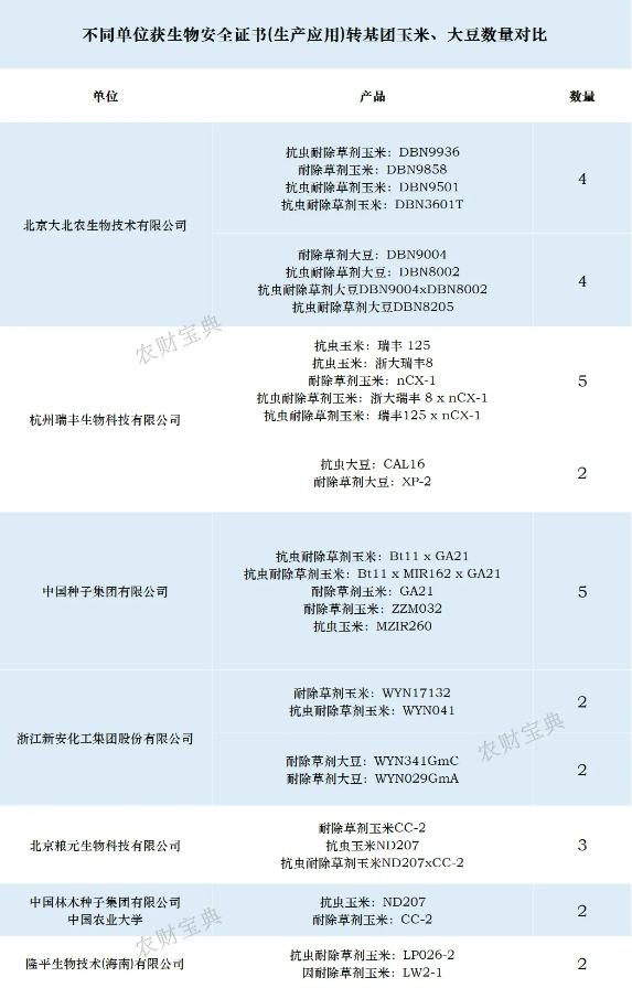 在安全证书方面,目前我国已发放多个玉米、大豆的农业转基因生物安全证书(生产应用),大北农、杭州瑞丰、中国种子集团、新安化工等企业拥有较多安全证书。其他企业也在发力,陆续获批证书取得突破。
