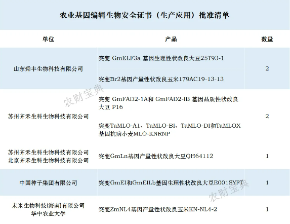 在基因编辑方面,我国也已批准发放多张安全证书,涵盖玉米、大豆、小麦等作物。