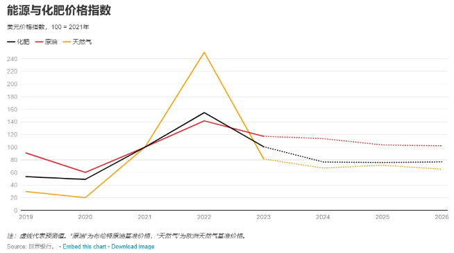 农业投入品成本下降可以暂时缓解农产品价格的上涨。预计2025年能源和化肥价格将分别下降6%和2%。这反映了石油和煤炭价格的下降,使农业生产者不必面临像2022和2023年生产季节那样的成本压力。值得一提的是,化肥可负担性指数(化肥价格与农产品价格之比)现已恢复到疫情前水平。然而风险依然存在:中东冲突升级或俄罗斯天然气出口减少可能会扭转能源价格的下降趋势,推高石油和天然气价格。这种情况可能导致化肥生产成本上升,从而再次推高食品类大宗商品价格。