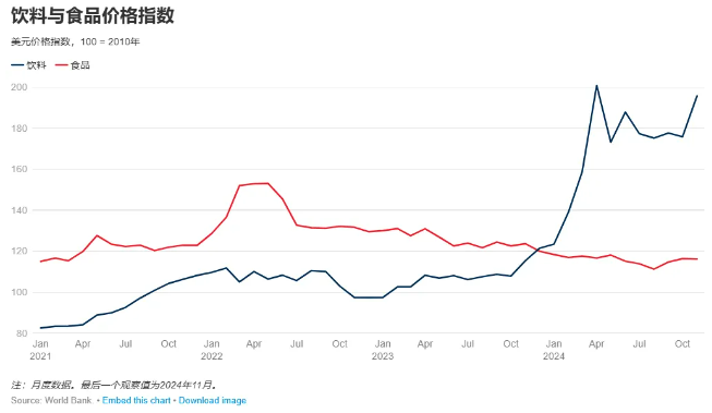 2024年下半年,饮料产品价格的创纪录上升给世界银行农产品价格指数带来了上涨势头,但这种上涨在一定程度上被食品价格的下跌所抵消。预计2025年农产品价格将下降4%,然后在2026年趋稳。不过这一前景面临诸多风险,包括极端天气事件、投入品成本波动、贸易限制以及气候变化和生物燃料强制性要求的不断变化等长期挑战。